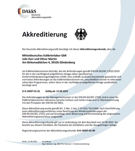 Wir sind seit dem 17. Oktober 2014 offiziell als Kalibrierlabor akkreditiert. Wir bieten Ihnen hier die Möglichkeit, einen Blick auf unser Akkreditierungszertifikat zu werfen und dieses nach Wunsch herunterzuladen. Ein Klick auf die Urkunden-Vorschau genügt zur Einsicht in das Zertifikat: